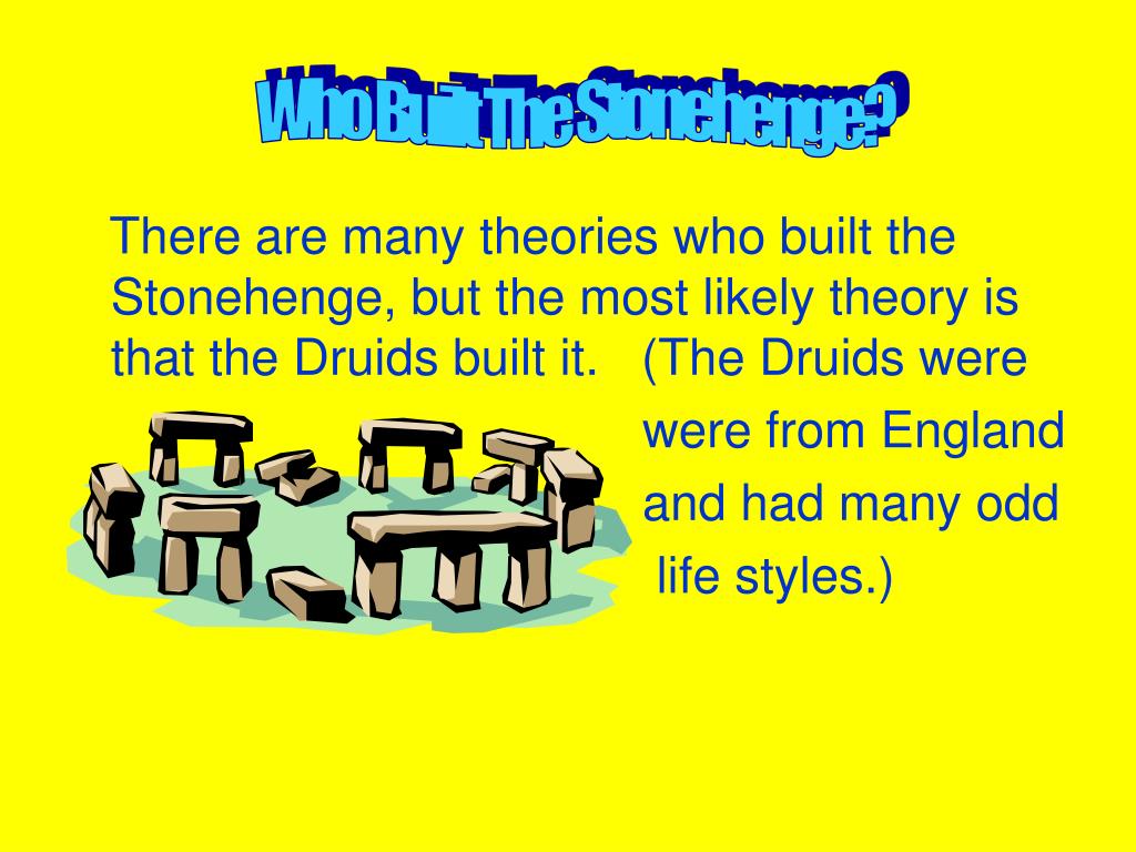 Who Built The Stonehenge? There are many theories who built the Stonehenge, but the most likely theory is that the Druids built it. (The Druids were were from England and had many odd life styles.)
