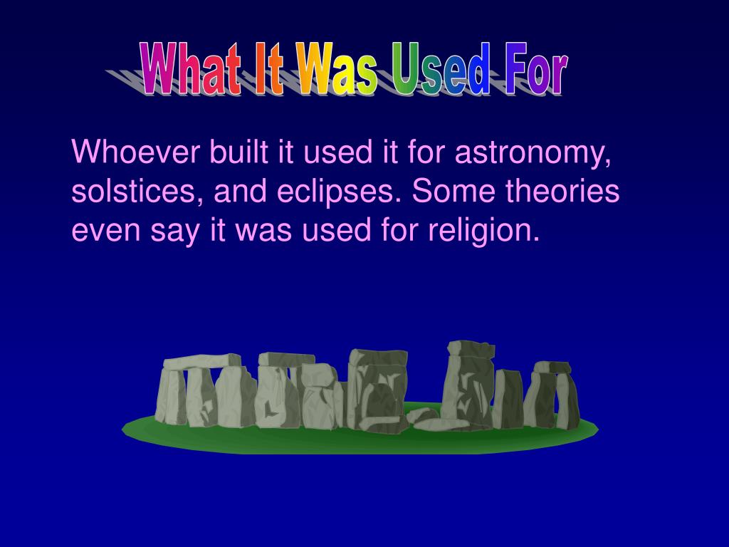 What It Was Used For Whoever built it used it for astronomy, solstices, and eclipses. Some theories even say it was used for religion.