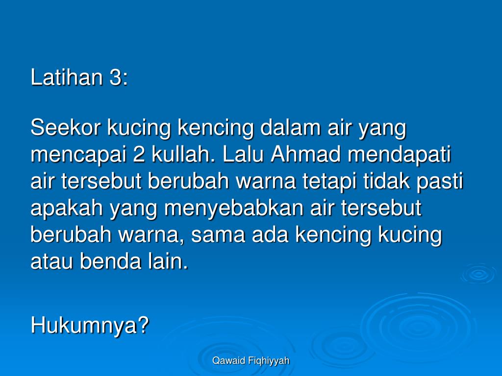 Latihan 3: Seekor kucing kencing dalam air yang mencapai 2 kullah. Lalu Ahmad mendapati air tersebut berubah warna tetapi tidak pasti apakah yang menyebabkan air tersebut berubah warna, sama ada kencing kucing atau benda lain. Hukumnya? Qawaid Fiqhiyyah