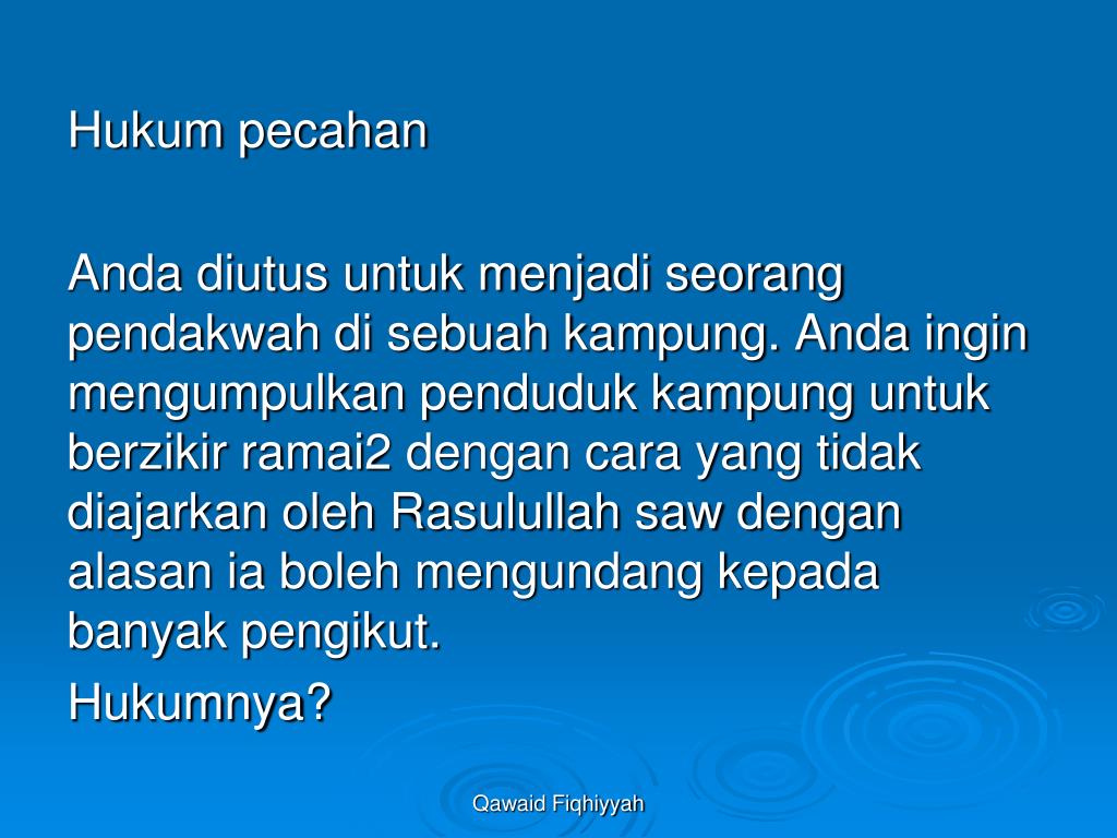 Hukum pecahan Anda diutus untuk menjadi seorang pendakwah di sebuah kampung. Anda ingin mengumpulkan penduduk kampung untuk berzikir ramai2 dengan cara yang tidak diajarkan oleh Rasulullah saw dengan alasan ia boleh mengundang kepada banyak pengikut. Hukumnya? Qawaid Fiqhiyyah