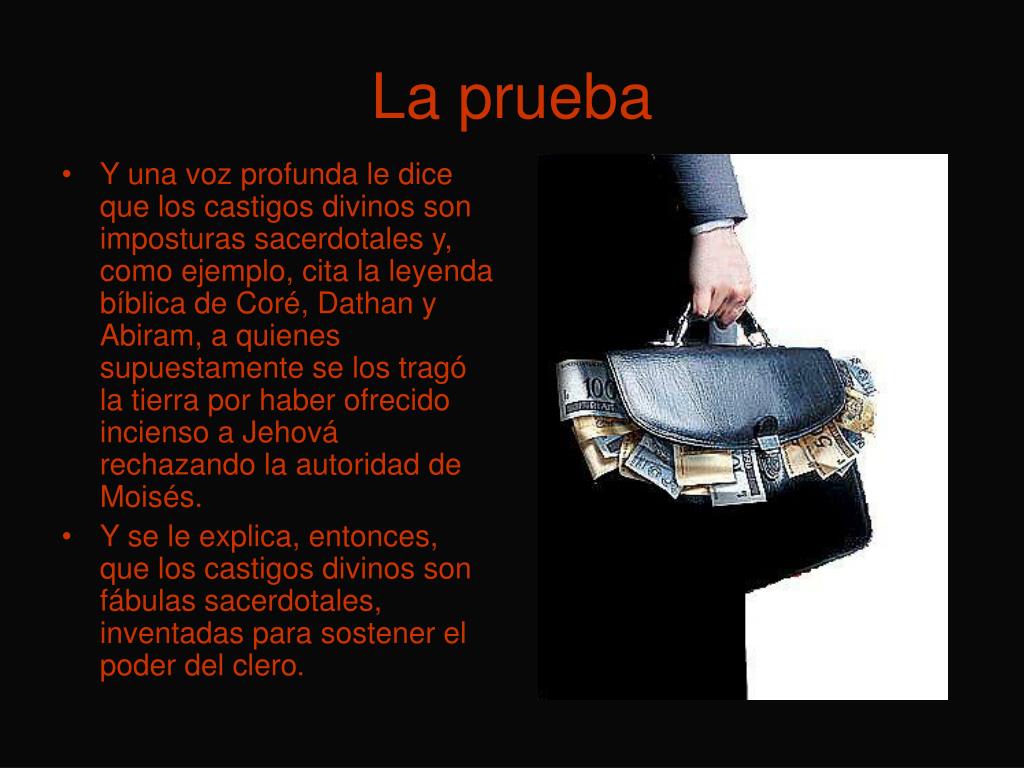 La prueba • Y una voz profunda le dice que los castigos divinos son imposturas sacerdotales y, como ejemplo, cita la leyenda bíblica de Coré, Dathan y Abiram, a quienes supuestamente se los tragó la tierra por haber ofrecido incienso a Jehová rechazando la autoridad de Moisés. • Y se le explica, entonces, que los castigos divinos son fábulas sacerdotales, inventadas para sostener el poder del clero.
