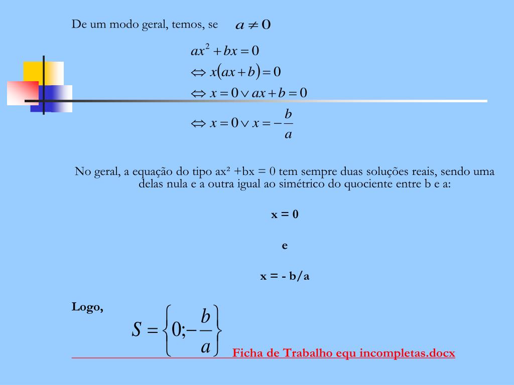 De um modo geral, temos, se No geral, a equação do tipo ax² +bx = 0 tem sempre duas soluções reais, sendo uma delas nula e a outra igual ao simétrico do quociente entre b e a: x = 0 e x = - b/a Logo, Ficha de Trabalho equ incompletas.docx