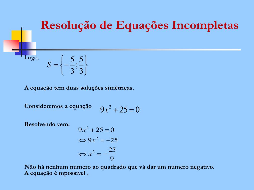 Resolução de Equações Incompletas Logo, A equação tem duas soluções simétricas. Consideremos a equação Resolvendo vem: Não há nenhum número ao quadrado que vá dar um número negativo. A equação é mpossível .