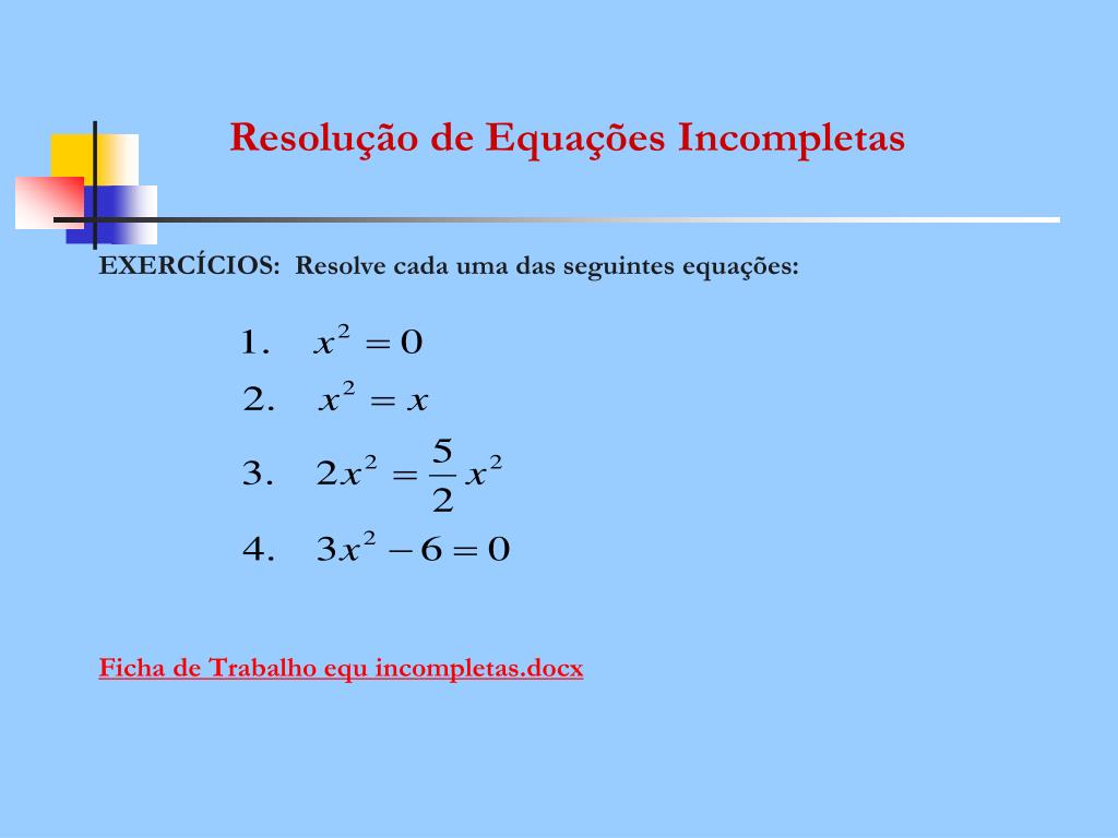 Resolução de Equações Incompletas EXERCÍCIOS: Resolve cada uma das seguintes equações: Ficha de Trabalho equincompletas.docx