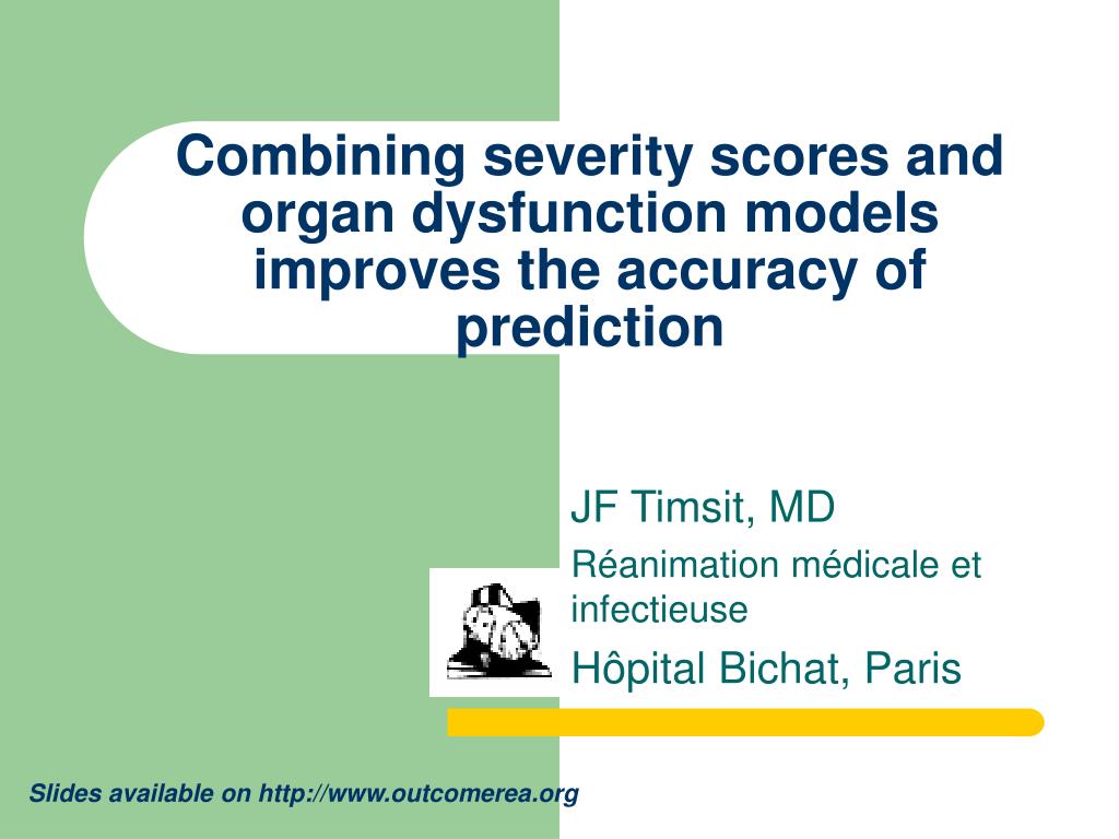 Combining severity scores and organ dysfunction models improves the accuracy of prediction. JF Timsit, MD Réanimation médicale et infectieuse Hôpital Bichat, Paris. Slides available on http://www.outcomerea.org. Combining Organ dysfonction and severity scores. Is stupid (multicolinearity)