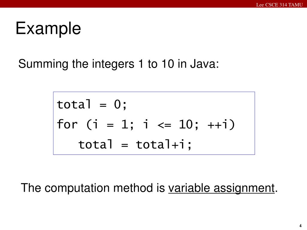Example Summing the integers 1 to 10 in Java: total = 0; for (i = 1; i <= 10; ++i) total = total+i; The computation method is variable assignment.