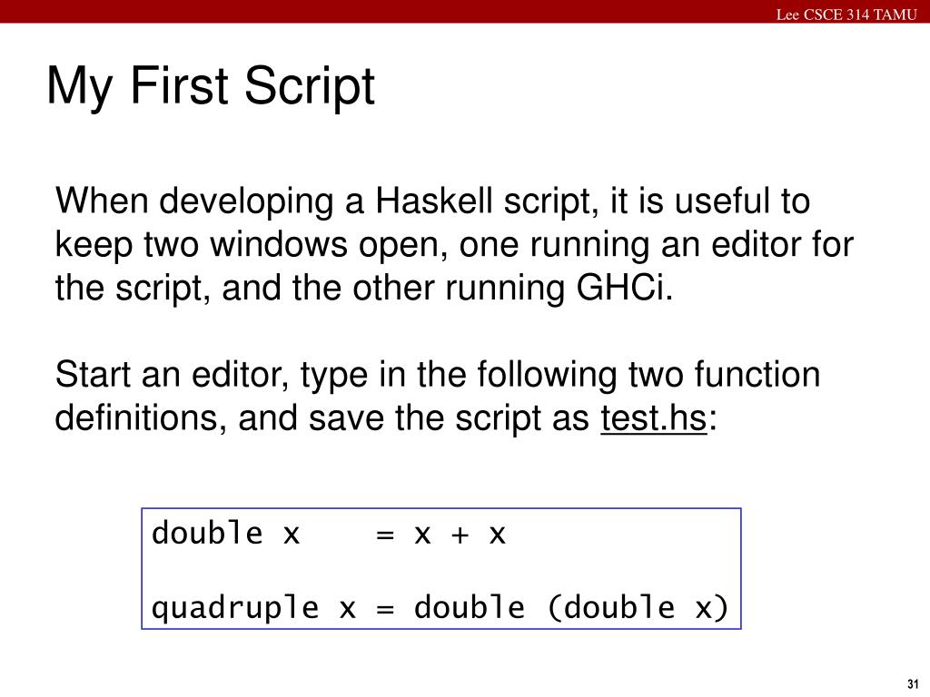 My First Script When developing a Haskell script, it is useful to keep two windows open, one running an editor for the script, and the other running GHCi. Start an editor, type in the following two function definitions, and save the script as test.hs: double x = x + x quadruple x = double (double x)