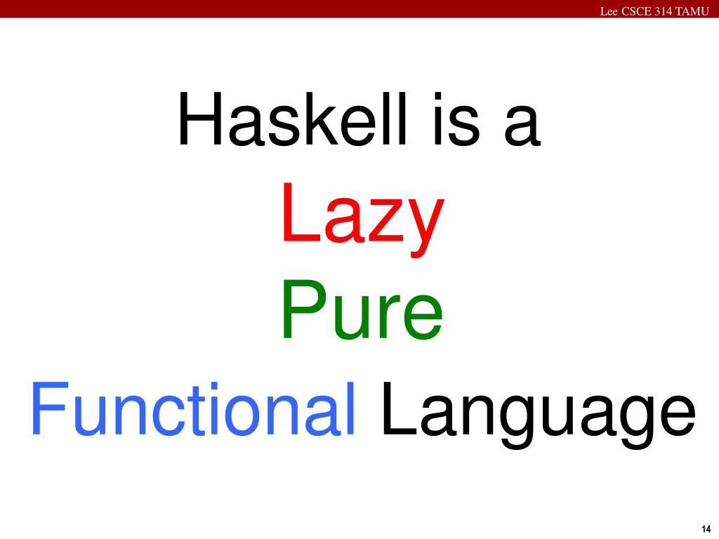 “Haskell is a Lazy Pure Functional Language” Functional language supports the functional programming style where the basic method of computation is application of functions to arguments. For example, in C, int s = 0; for (int i=1; i <= 100; ++i) s = s + i; is written in Haskell as sum [1..100]