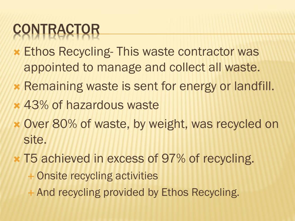 Ethos Recycling- This waste contractor was appointed to manage and collect all waste. • Remaining waste is sent for energy or landfill. • 43% of hazardous waste • Over 80% of waste, by weight, was recycled on site. • T5 achieved in excess of 97% of recycling. • Onsite recycling activities • And recycling provided by Ethos Recycling. Contractor