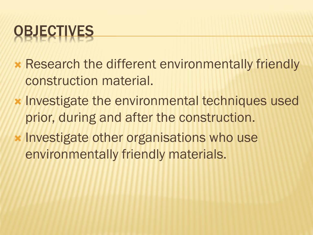 Research the different environmentally friendly construction material. Investigate the environmental techniques used prior, during and after the construction. Investigate other organisations who use environmentally friendly materials. Objectives