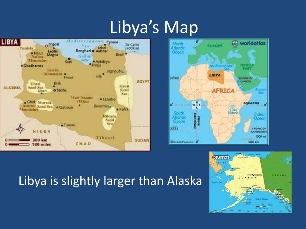 Islamic Country Libya. BY: Taylor Earley. Libya’s Map. Libya is slightly larger than Alaska. Libyan Flag!. The Red color was for the blood of the Libyan people, green represents freedom, and the cresent is for Islam. Natural Resources.