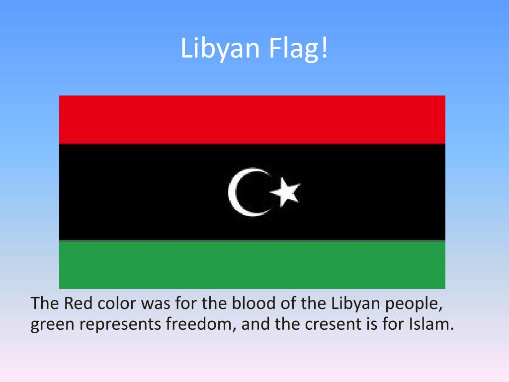 Libyan Flag! The Red color was for the blood of the Libyan people, green represents freedom, and the cresent is for Islam.