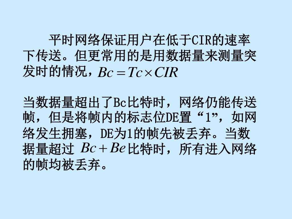 平时网络保证用户在低于CIR的速率下传送。但更常用的是用数据量来测量突发时的情况,当数据量超出了Bc比特时,网络仍能传送帧,但是将帧内的标志位DE置“1”,如网络发生拥塞,DE为1的帧先被丢弃。当数据量超过 比特时,所有进入网络的帧均被丢弃。