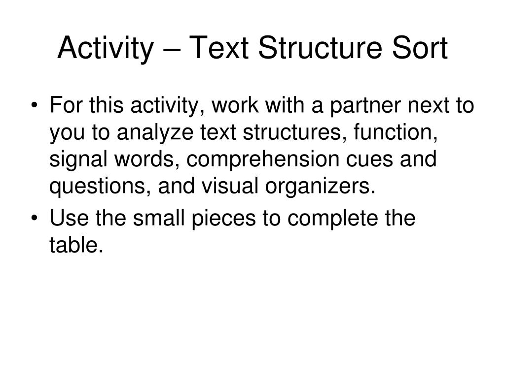 Activity – Text Structure Sort • For this activity, work with a partner next to you to analyze text structures, function, signal words, comprehension cues and questions, and visual organizers. • Use the small pieces to complete the table.