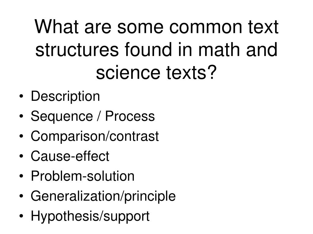 What are some common text structures found in math and science texts? • Description • Sequence / Process • Comparison/contrast • Cause-effect • Problem-solution • Generalization/principle • Hypothesis/support