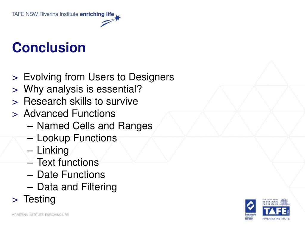 Conclusion • Evolving from Users to Designers • Why analysis is essential? • Research skills to survive • Advanced Functions • Named Cells and Ranges • Lookup Functions • Linking • Text functions • Date Functions • Data and Filtering • Testing