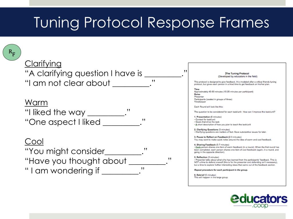 Tuning Protocol Response Frames Clarifying “A clarifying question I have is _________.” “I am not clear about _________.” Warm “I liked the way _________.” “One aspect I liked _________.” Cool “You might consider_________.” “Have you thought about _________.” “ I am wondering if _________.”