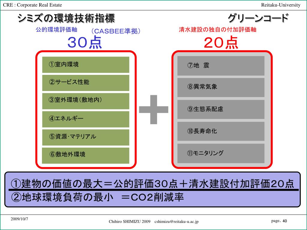 シミズの環境技術指標 グリーンコード 公的環境評価軸 清水建設の独自の付加評価軸 (CASBEE準拠) 30点 20点 ①室内環境 ⑦地 震 ②サービス性能 ⑧異常気象 ③室外環境(敷地内) ⑨生態系配慮 ④エネルギー ⑩長寿命化 ⑤資源・マテリアル ⑪モニタリング ⑥敷地外環境 ①建物の価値の最大=公的評価30点+清水建設付加評価20点 ②地球環境負荷の最小 =CO2削減率 Chihiro SHIMIZU 2009 cshimizu@reitaku-u.ac.jp