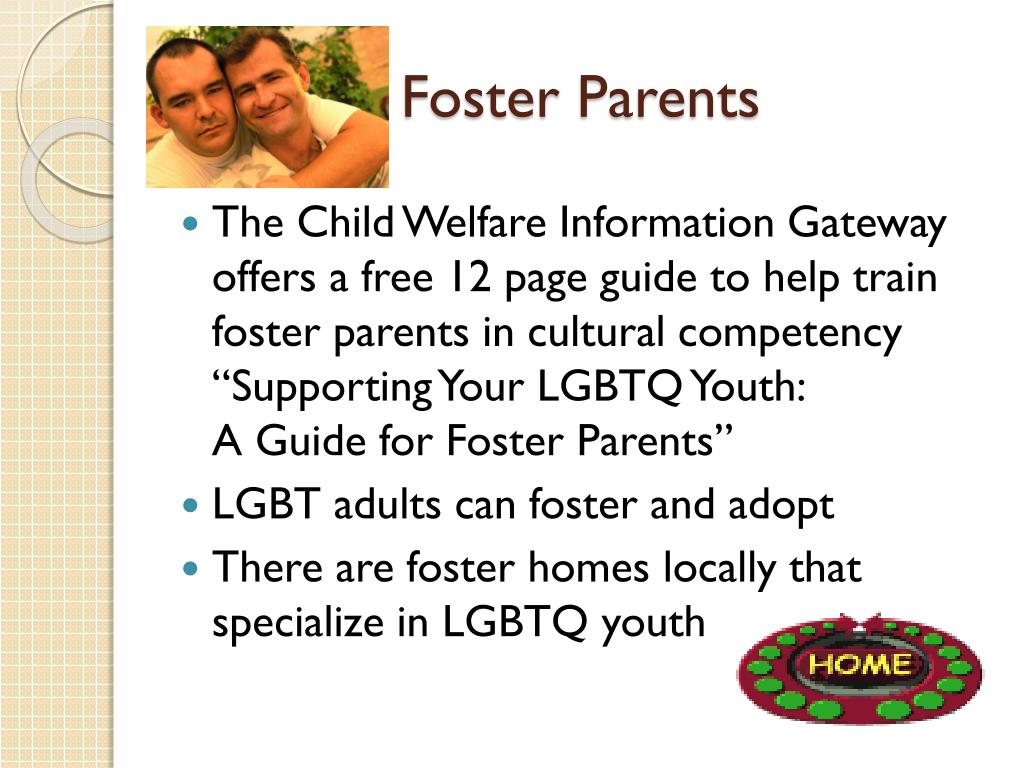 Foster Parents • The Child Welfare Information Gateway offers a free 12 page guide to help train foster parents in cultural competency “Supporting Your LGBTQ Youth:A Guide for Foster Parents” • LGBT adults can foster and adopt • There are foster homes locally that specialize in LGBTQ youth