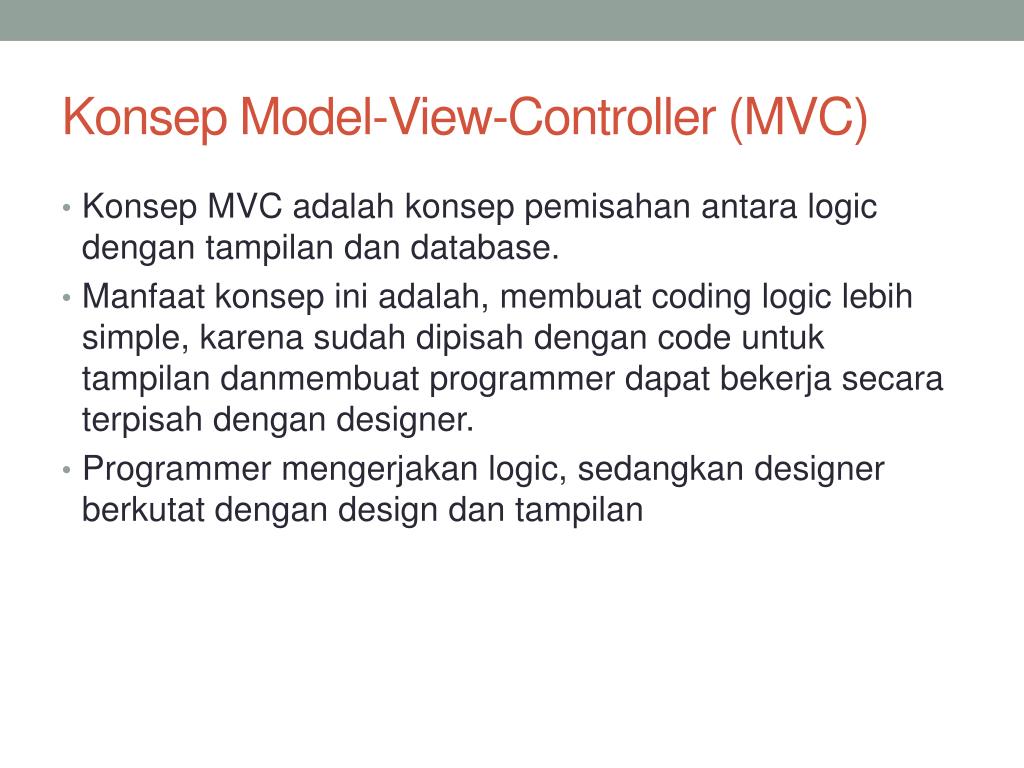 Konsep Model-View-Controller (MVC) • Konsep MVC adalahkonseppemisahanantara logic dengantampilandan database. • Manfaatkonsepiniadalah, membuat coding logic lebih simple, karenasudahdipisahdengan code untuktampilandanmembuat programmer dapatbekerjasecaraterpisahdengan designer. • Programmer mengerjakan logic, sedangkan designer berkutatdengan design dantampilan
