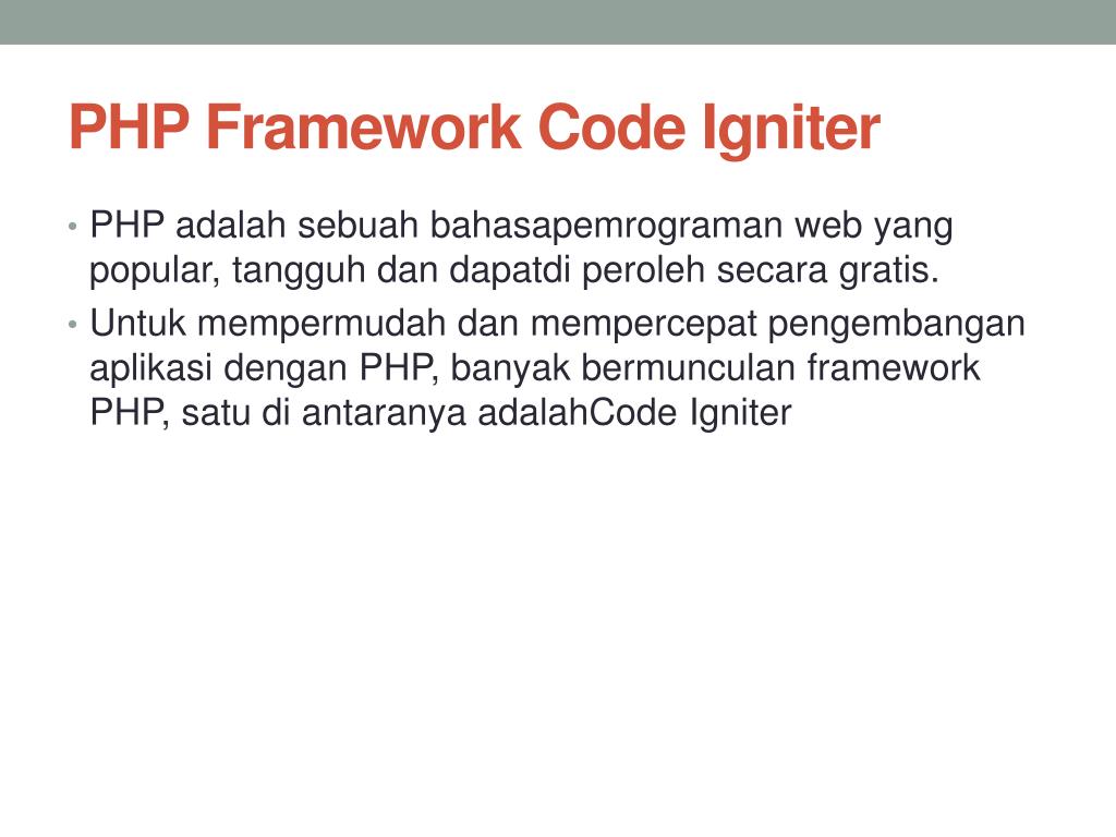 PHP Framework Code Igniter • PHP adalahsebuahbahasapemrograman web yang popular, tangguhdandapatdiperolehsecara gratis. • Untukmempermudahdanmempercepatpengembanganaplikasidengan PHP, banyakbermunculan framework PHP, satu di antaranyaadalahCodeIgniter