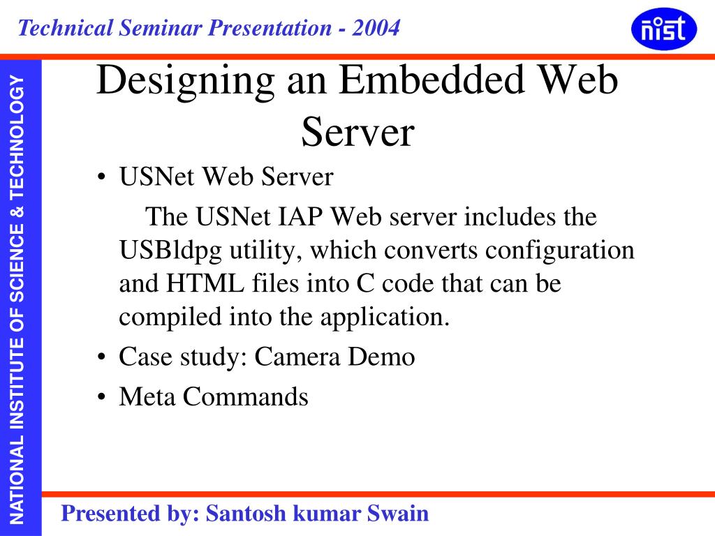USNet Web Server The USNet IAP Web server includes the USBldpg utility, which converts configuration and HTML files into C code that can be compiled into the application. Case study: Camera Demo Meta Commands Designing an Embedded Web Server