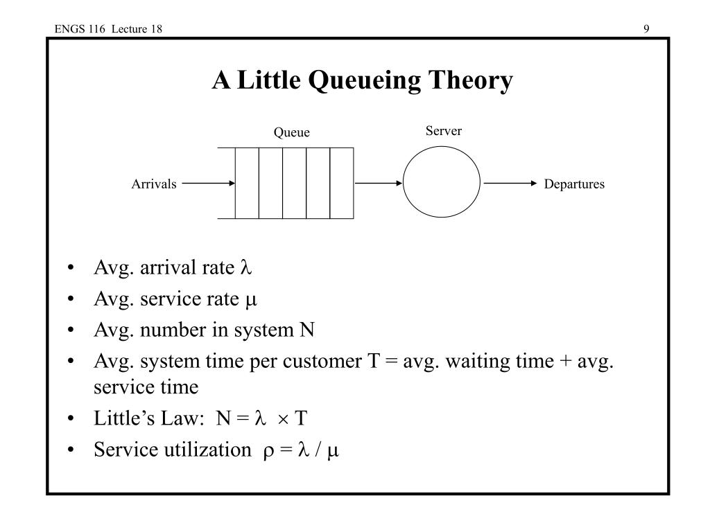 Server Queue Arrivals Departures ENGS 116 Lecture 18 A Little Queueing Theory • Avg. arrival rate • Avg. service rate • Avg. number in system N • Avg. system time per customer T = avg. waiting time + avg. service time • Little’s Law: N = T • Service utilization = /