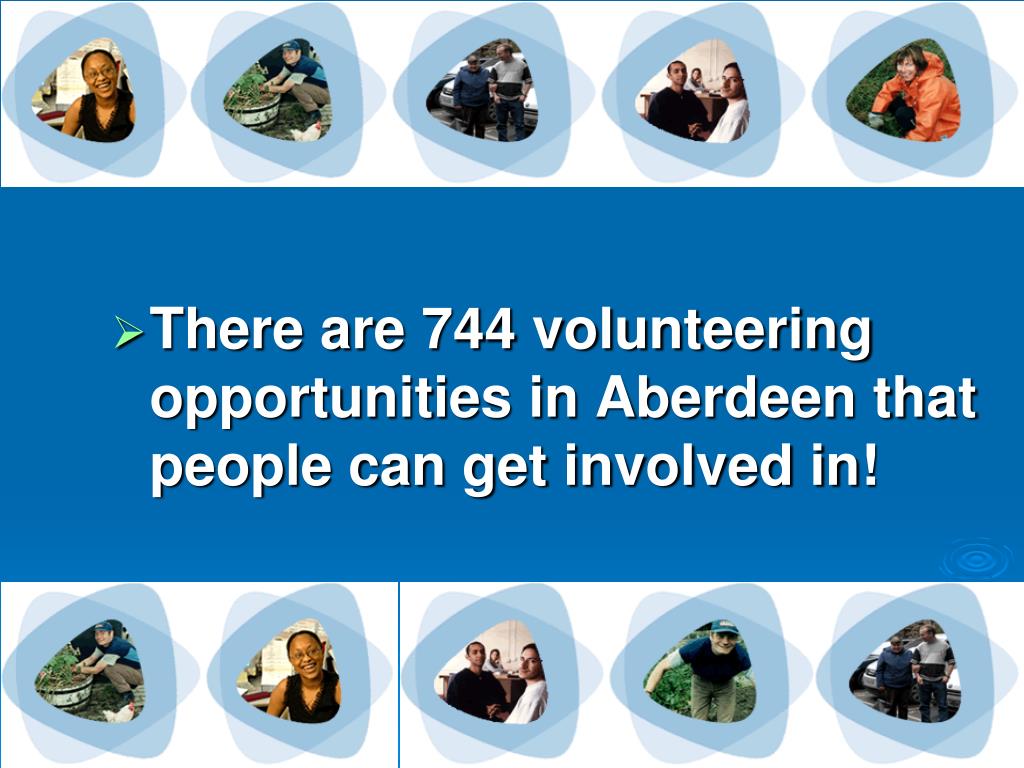 Aberdeen Volunteer Centre. Volunteering Opportunities. There are 744 volunteering opportunities in Aberdeen that people can get involved in!. Be amazed at how you can help!!!. -advice-appeals–arts & crafts-befriending -children-caring-computing-counselling-disability