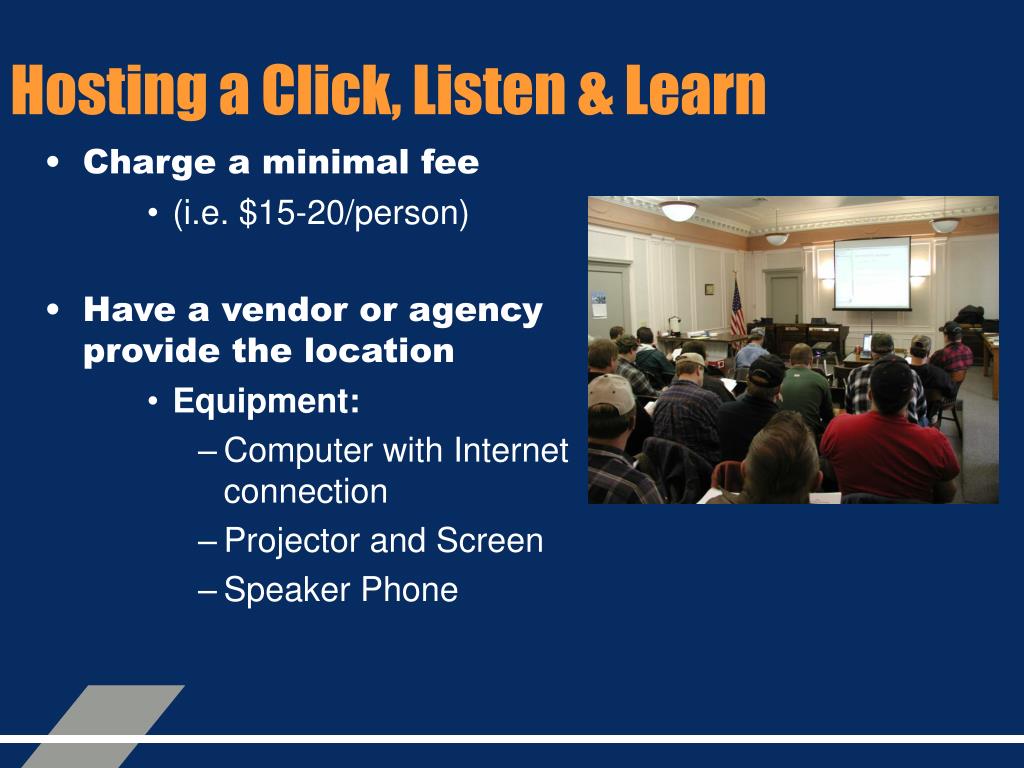 Hosting a Click, Listen & Learn • Charge a minimal fee • (i.e. $15-20/person) • Have a vendor or agency provide the location • Equipment: • Computer with Internet connection • Projector and Screen • Speaker Phone