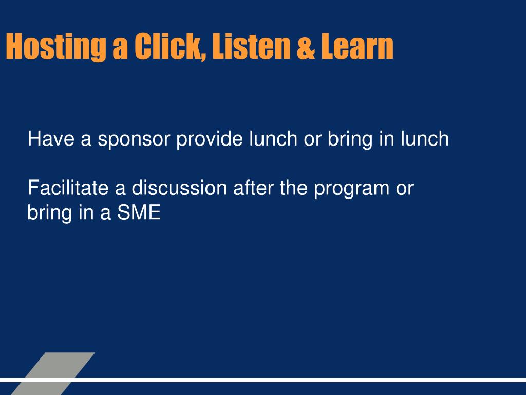 Hosting a Click, Listen & Learn Have a sponsor provide lunch or bring in lunch Facilitate a discussion after the program or bring in a SME