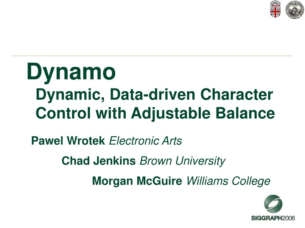 Dynamo Dynamic, Data-driven Character Control with Adjustable Balance. Pawel Wrotek Electronic Arts Chad Jenkins Brown University Morgan McGuire Williams College. First, a video…. Character Motion. An integral part of modern video games. FIFA 2006 (EA). San Andreas (Rockstar).