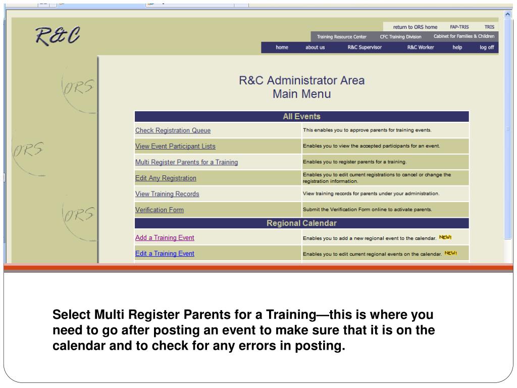 R&C Regional Calendar. Steps for posting a training (single event or series) to the regional calendar. Select ORS. Select Resource Parent Registration. Log on using your ORS username and password. Select R&C Supervisor Entry.