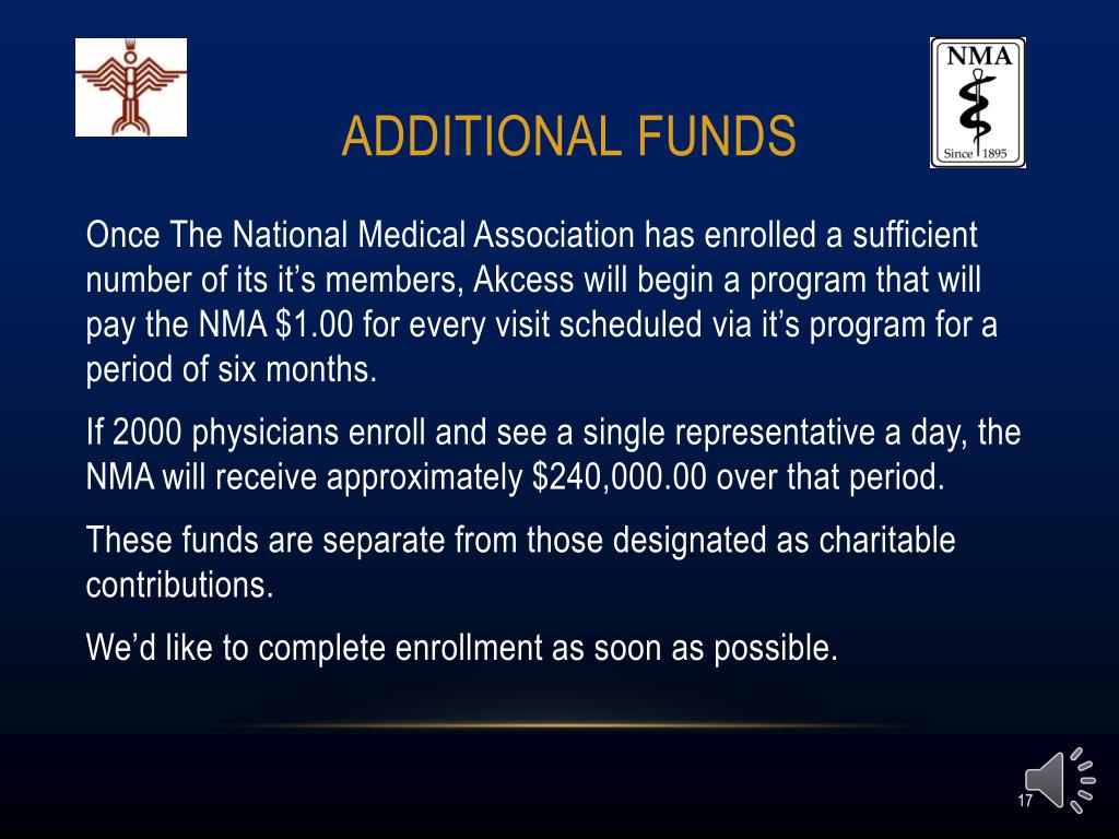 Additional Funds Once The National Medical Association has enrolled a sufficient number of its it’s members, Akcess will begin a program that will pay the NMA $1.00 for every visit scheduled via it’s program for a period of six months. If 2000 physicians enroll and see a single representative a day, the NMA will receive approximately $240,000.00 over that period. These funds are separate from those designated as charitable contributions. We’d like to complete enrollment as soon as possible.