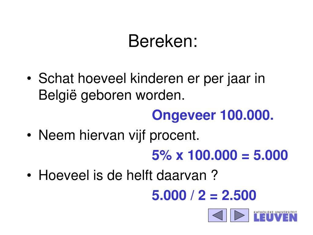 Bereken: • Schat hoeveel kinderen er per jaar in België geboren worden. Ongeveer100.000. • Neem hiervan vijf procent. 5% x 100.000 = 5.000 • Hoeveel is de helft daarvan ? 5.000 / 2 = 2.500