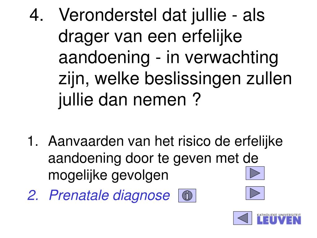 Veronderstel dat jullie - als drager van een erfelijke aandoening - in verwachting zijn, welke beslissingen zullen jullie dan nemen ? • Aanvaarden van het risico de erfelijke aandoening door te geven met de mogelijke gevolgen • Prenatale diagnose
