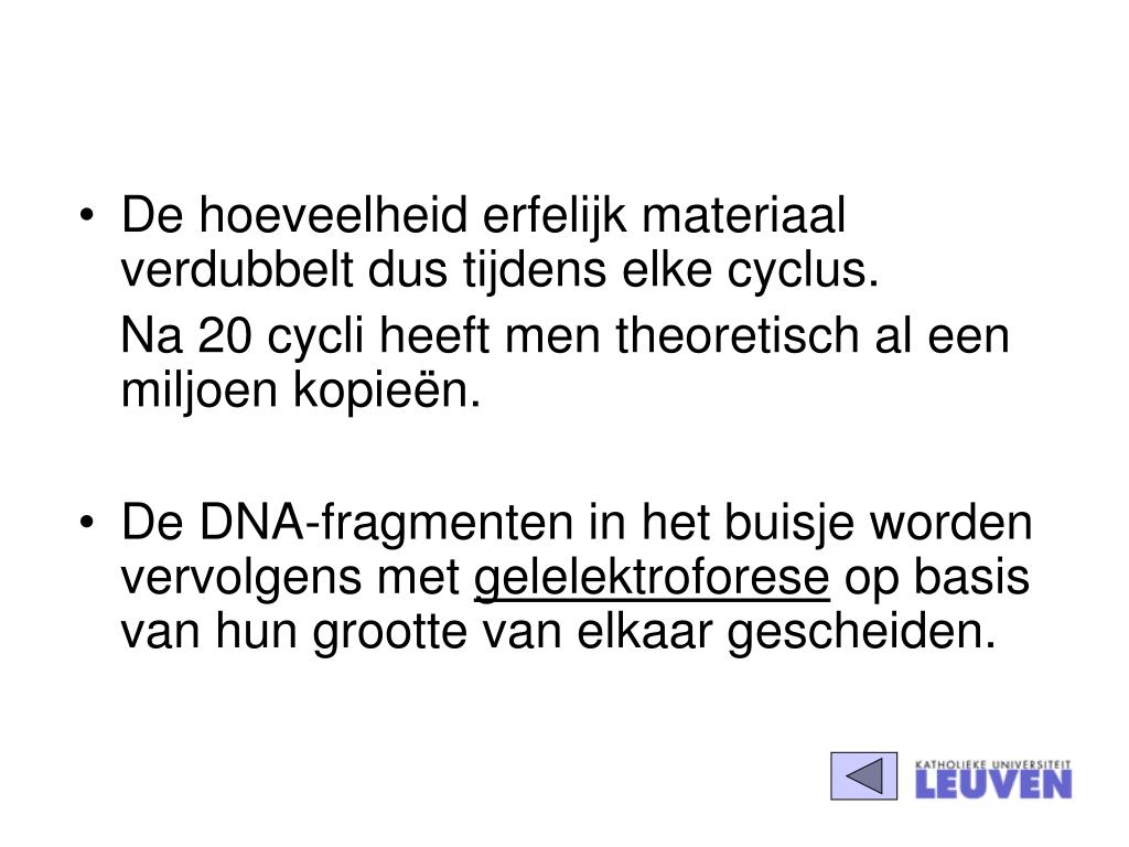De hoeveelheid erfelijk materiaal verdubbelt dus tijdens elke cyclus. Na 20 cycli heeft men theoretisch al een miljoen kopieën. • De DNA-fragmenten in het buisje worden vervolgens met gelelektroforese op basis van hun grootte van elkaar gescheiden.