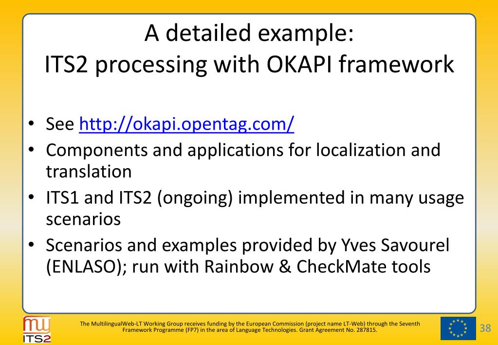 A detailed example:ITS2 processing with OKAPI framework See http://okapi.opentag.com/ Components and applications for localization and translation ITS1 and ITS2 (ongoing) implemented in many usage scenarios Scenarios and examples provided by Yves Savourel(ENLASO); run with Rainbow & CheckMate tools