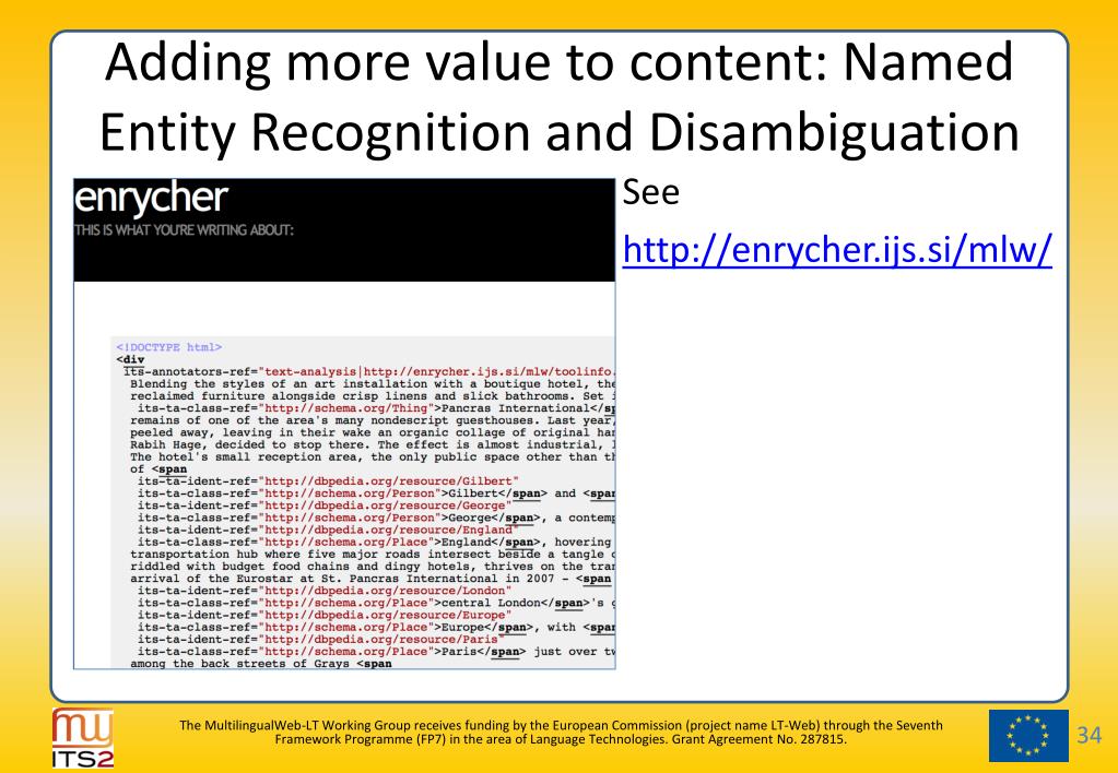 Adding more value to content: Named Entity Recognition and Disambiguation See http://enrycher.ijs.si/mlw/
