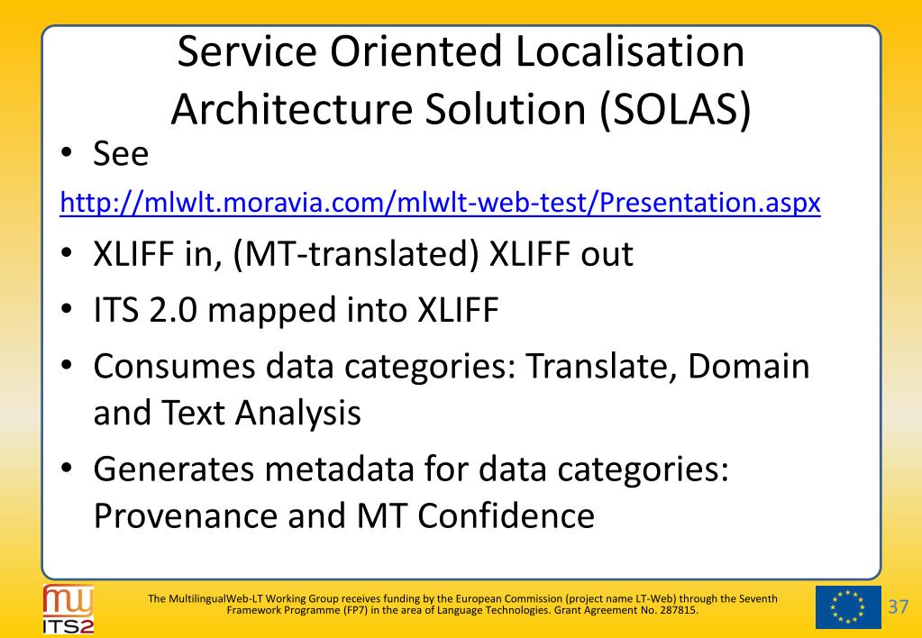 Service Oriented Localisation Architecture Solution (SOLAS) See http://mlwlt.moravia.com/mlwlt-web-test/Presentation.aspx XLIFF in, (MT-translated) XLIFF out ITS 2.0 mapped into XLIFF Consumes data categories: Translate, Domain and Text Analysis Generates metadata for data categories: Provenance and MT Confidence