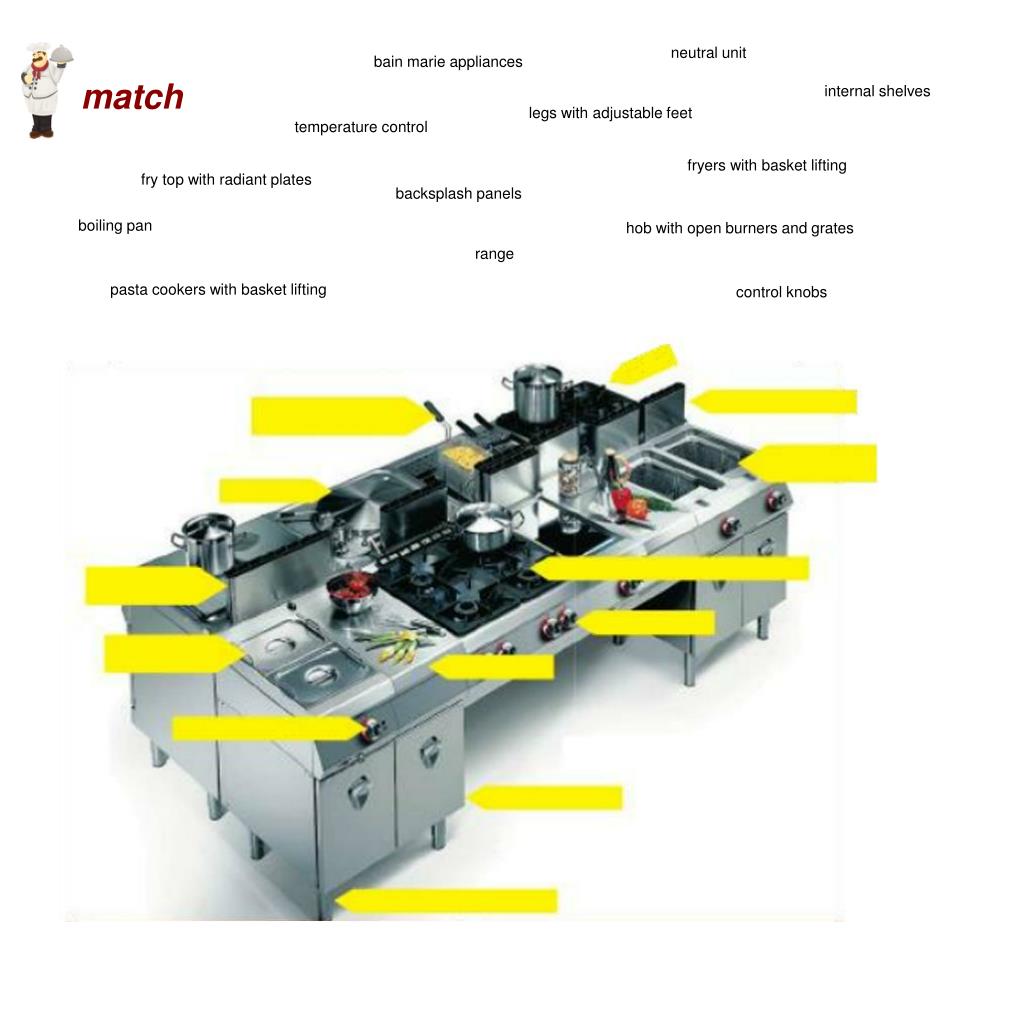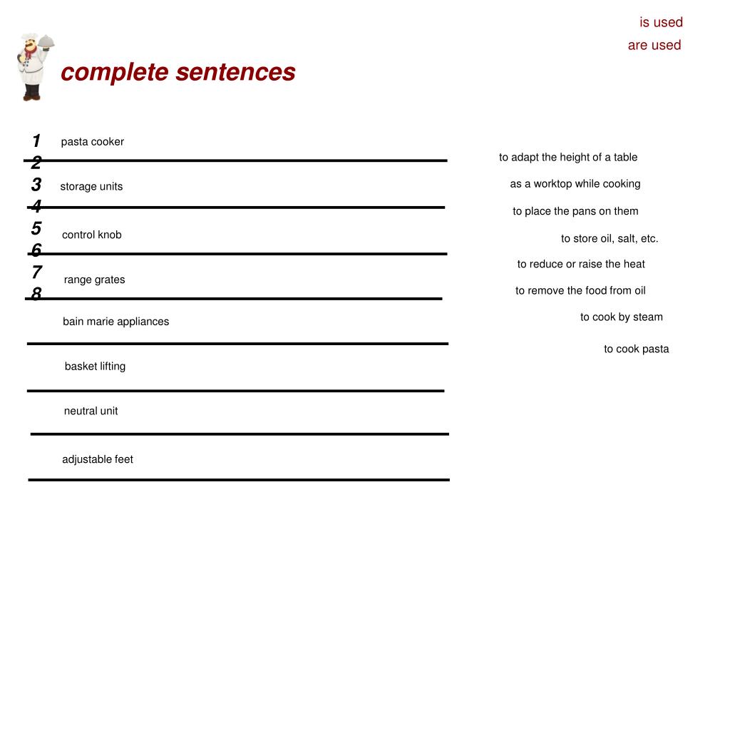 is used are used complete sentences 1 2 3 4 5 6 7 8 pasta cooker to adapt the height of a table as a worktop while cooking storage units to place the pans on them control knob to store oil, salt, etc. to reduce or raise the heat range grates to remove the food from oil to cook by steam bain marie appliances to cook pasta basket lifting neutral unit adjustable feet