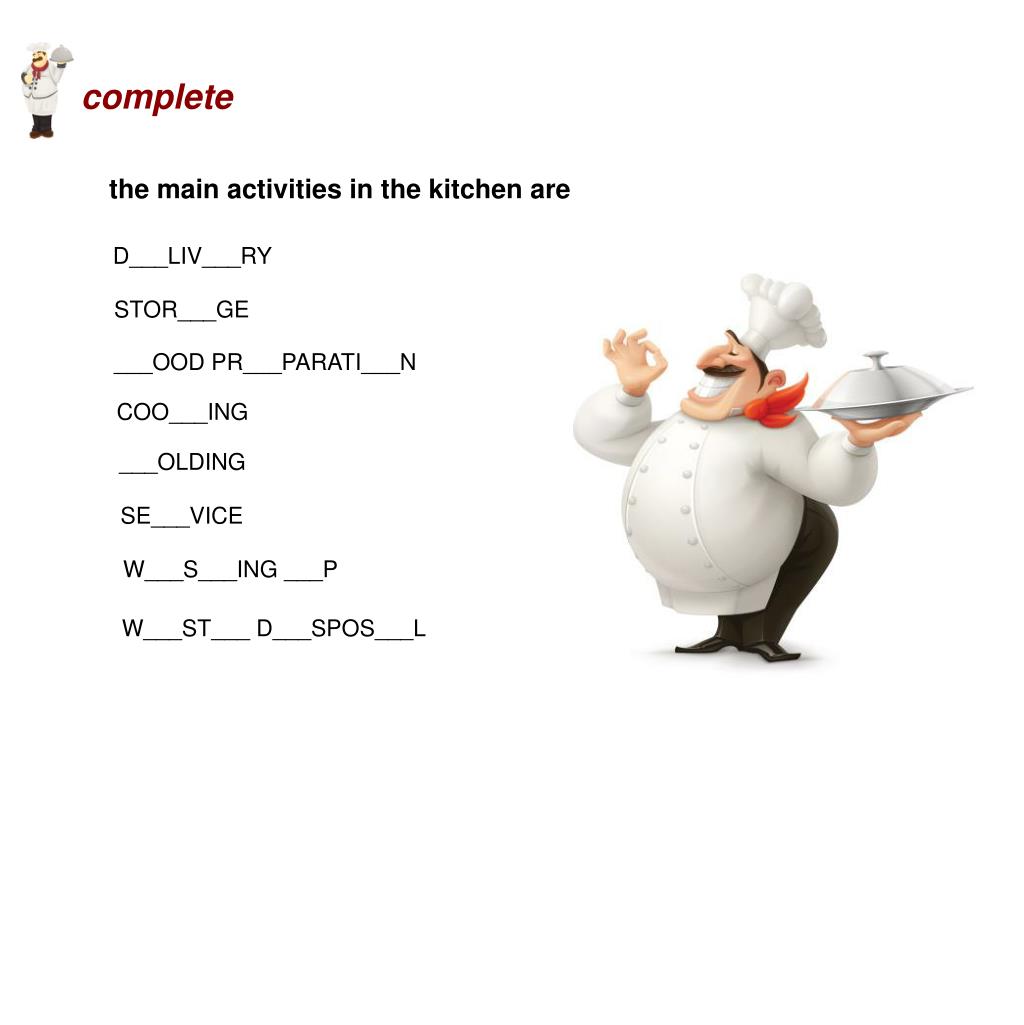 complete the main activities in the kitchen are D___LIV___RY STOR___GE ___OOD PR___PARATI___N COO___ING ___OLDING SE___VICE W___S___ING ___P W___ST___ D___SPOS___L