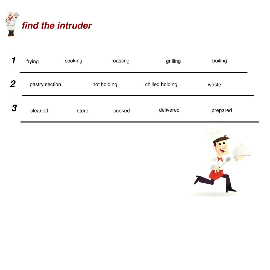 find the intruder 1 cooking roasting boiling grilling frying 2 pastry section hot holding chilled holding waste 3 delivered prepared cleaned store cooked