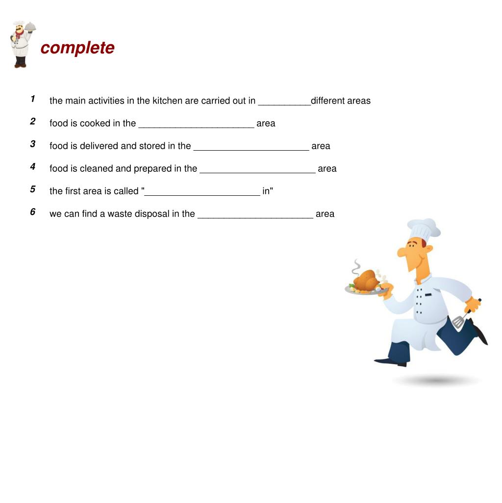 complete 1 2 3 4 5 6 the main activities in the kitchen are carried out in __________different areas food is cooked in the ______________________ area food is delivered and stored in the ______________________ area food is cleaned and prepared in the ______________________ area the first area is called "______________________ in" we can find a waste disposal in the ______________________ area