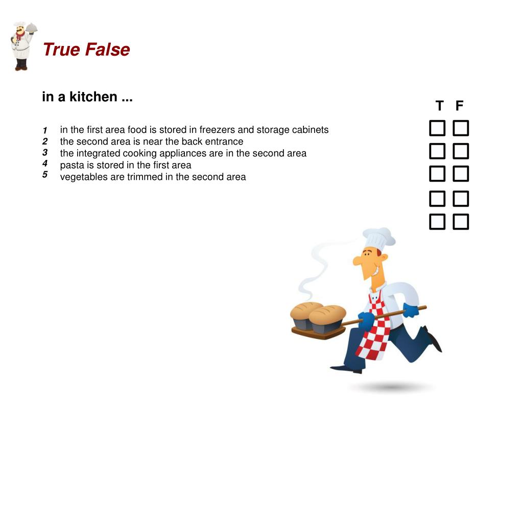 True False in a kitchen ... T F in the first area food is stored in freezers and storage cabinets the second area is near the back entrance the integrated cooking appliances are in the second area pasta is stored in the first area vegetables are trimmed in the second area 1 2 3 4 5