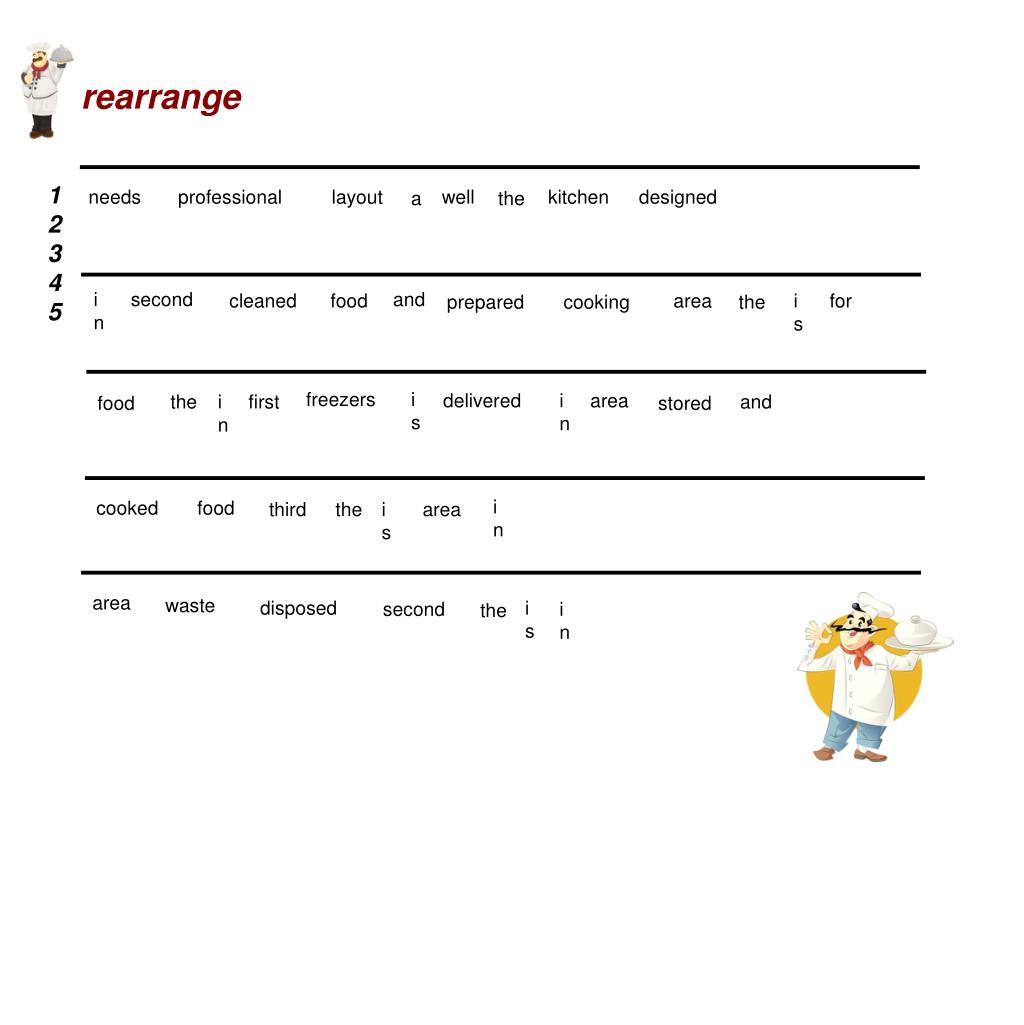 rearrange 1 2 3 4 5 needs professional layout well kitchen designed a the in second and cleaned food area is for prepared cooking the freezers is delivered in area the in first and food stored in cooked food third the is area area waste disposed is second in the