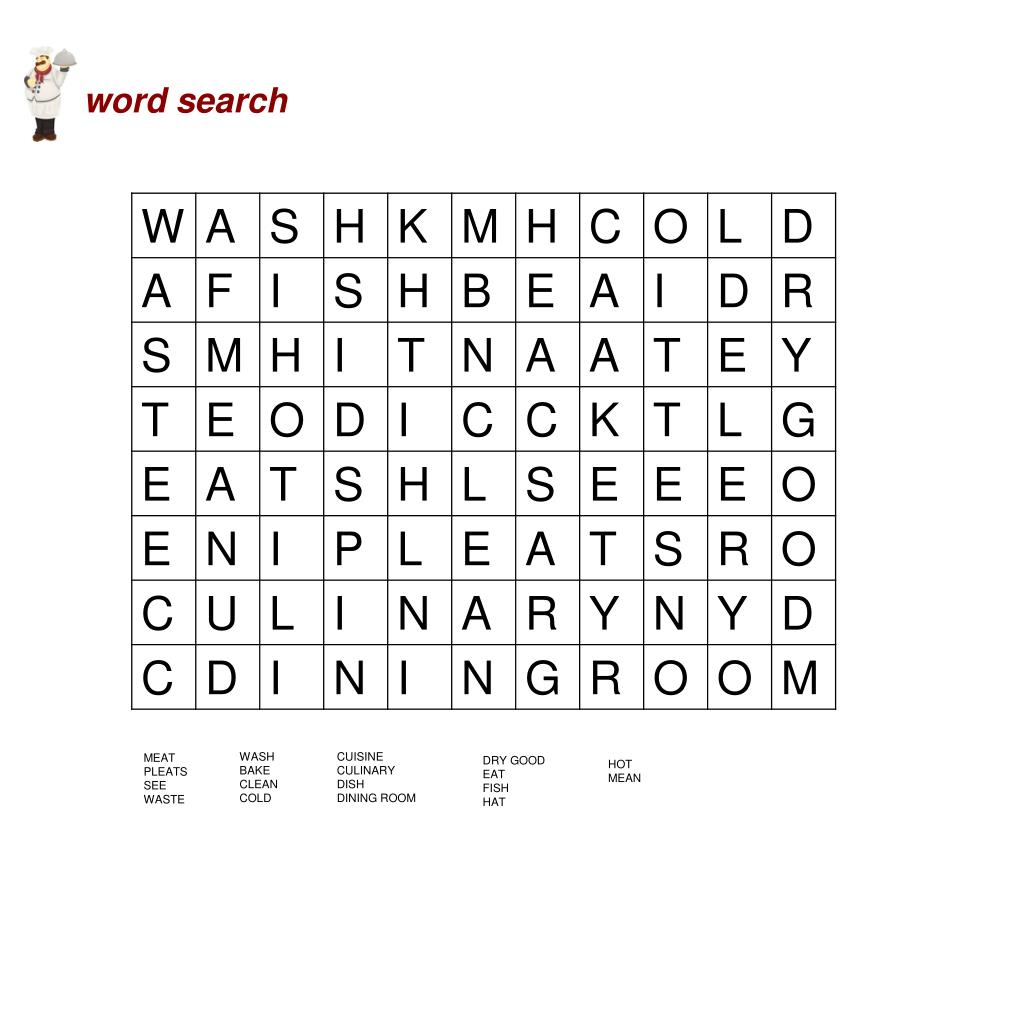 word search WASH BAKE CLEAN COLD CUISINE CULINARY DISH DINING ROOM MEAT PLEATS SEE WASTE DRY GOOD EAT FISH HAT HOT MEAN