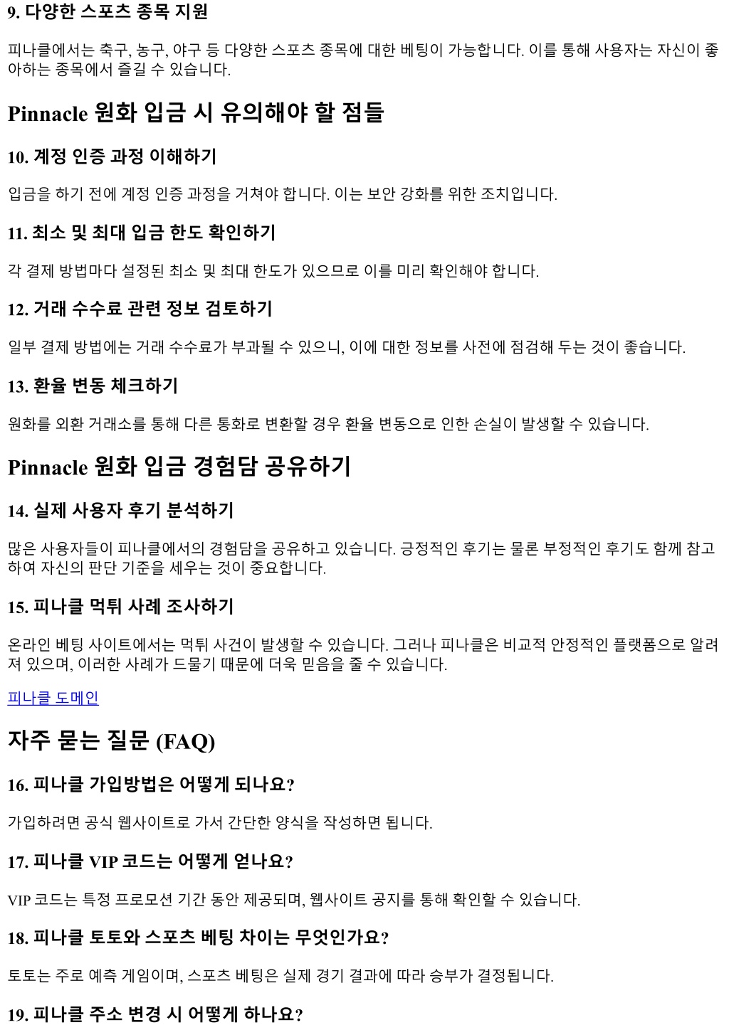 2. 9. 다양한스포츠종목지원 피나클에서는축구, 농구, 야구등다양한스포츠종목에대한베팅이가능합니다. 이를통해사용자는자신이좋 아하는종목에서즐길수있습니다. Pinnacle 원화입금시유의해야할점들 10. 계정인증과정이해하기 입금을하기전에계정인증과정을거쳐야합니다. 이는보안강화를위한조치입니다. 11. 최소및최대입금한도확인하기 각결제방법마다설정된최소및최대한도가있으므로이를미리확인해야합니다. 12. 거래수수료관련정보검토하기 일부결제방법에는거래수수료가부과될수있으니, 이에대한정보를사전에점검해두는것이좋습니다. 13. 환율변동체크하기 원화를외환거래소를통해다른통화로변환할경우환율변동으로인한손실이발생할수있습니다. Pinnacle 원화입금경험담공유하기 14. 실제사용자후기분석하기 많은사용자들이피나클에서의경험담을공유하고있습니다. 긍정적인후기는물론부정적인후기도함께참고 하여자신의판단기준을세우는것이중요합니다. 15. 피나클먹튀사례조사하기 온라인베팅사이트에서는먹튀사건이발생할수있습니다. 그러나피나클은비교적안정적인플랫폼으로알려 져있으며, 이러한사례가드물기때문에더욱믿음을줄수있습니다. 피나클도메인 자주묻는질문 (FAQ) 16. 피나클가입방법은어떻게되나요? 가입하려면공식웹사이트로가서간단한양식을작성하면됩니다. 17. 피나클 VIP 코드는어떻게얻나요? VIP 코드는특정프로모션기간동안제공되며, 웹사이트공지를통해확인할수있습니다. 18. 피나클토토와스포츠베팅차이는무엇인가요? 토토는주로예측게임이며, 스포츠베팅은실제경기결과에따라승부가결정됩니다. 19. 피나클주소변경시어떻게하나요?
