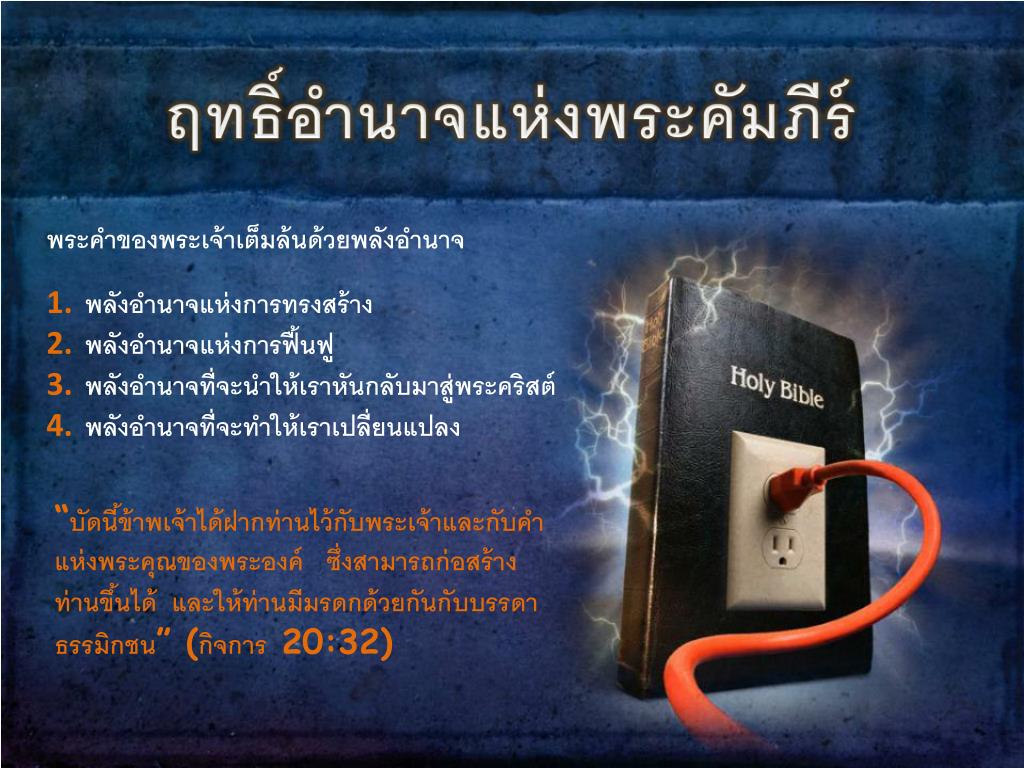 ฤทธิ์อำนาจแห่งพระคัมภีร์ฤทธิ์อำนาจแห่งพระคัมภีร์ พระคำของพระเจ้าเต็มล้นด้วยพลังอำนาจ พลังอำนาจแห่งการทรงสร้าง พลังอำนาจแห่งการฟื้นฟู พลังอำนาจที่จะนำให้เราหันกลับมาสู่พระคริสต์ พลังอำนาจที่จะทำให้เราเปลี่ยนแปลง “บัดนี้ข้าพเจ้าได้ฝากท่านไว้กับพระเจ้าและกับคำแห่งพระคุณของพระองค์ ซึ่งสามารถก่อสร้างท่านขึ้นได้ และให้ท่านมีมรดกด้วยกันกับบรรดาธรรมิกชน” (กิจการ 20:32)