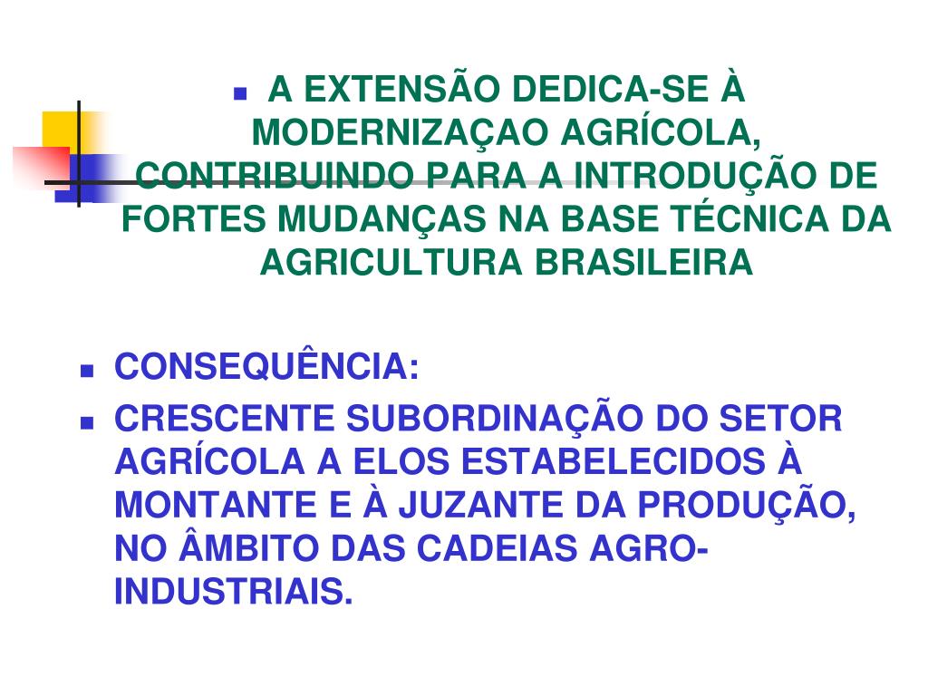 A EXTENSÃO DEDICA-SE À MODERNIZAÇAO AGRÍCOLA, CONTRIBUINDO PARA A INTRODUÇÃO DE FORTES MUDANÇAS NA BASE TÉCNICA DA AGRICULTURA BRASILEIRA • CONSEQUÊNCIA: • CRESCENTE SUBORDINAÇÃO DO SETOR AGRÍCOLA A ELOS ESTABELECIDOS À MONTANTE E À JUZANTE DA PRODUÇÃO, NO ÂMBITO DAS CADEIAS AGRO-INDUSTRIAIS.