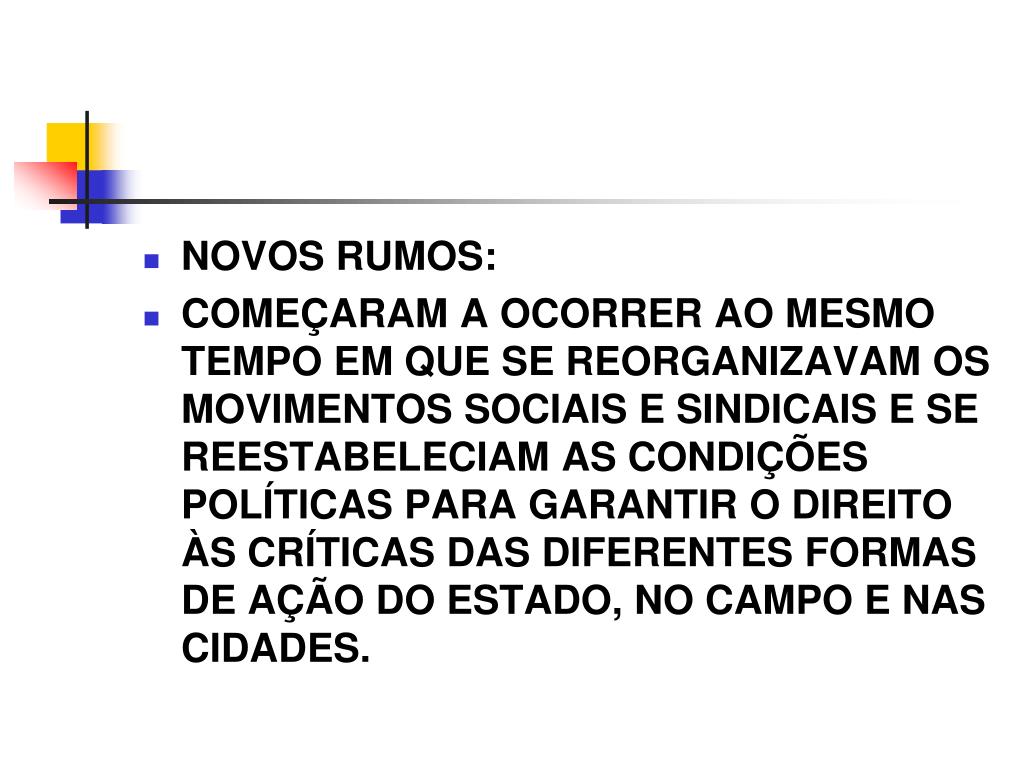 NOVOS RUMOS: • COMEÇARAM A OCORRER AO MESMO TEMPO EM QUE SE REORGANIZAVAM OS MOVIMENTOS SOCIAIS E SINDICAIS E SE REESTABELECIAM AS CONDIÇÕES POLÍTICAS PARA GARANTIR O DIREITO ÀS CRÍTICAS DAS DIFERENTES FORMAS DE AÇÃO DO ESTADO, NO CAMPO E NAS CIDADES.